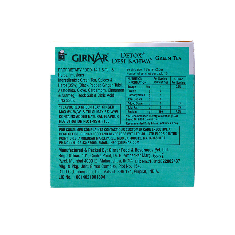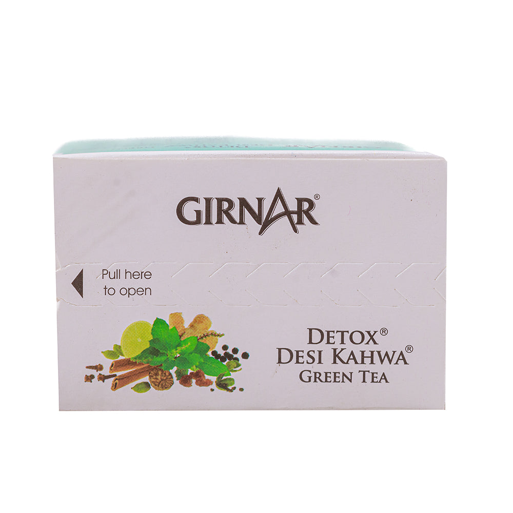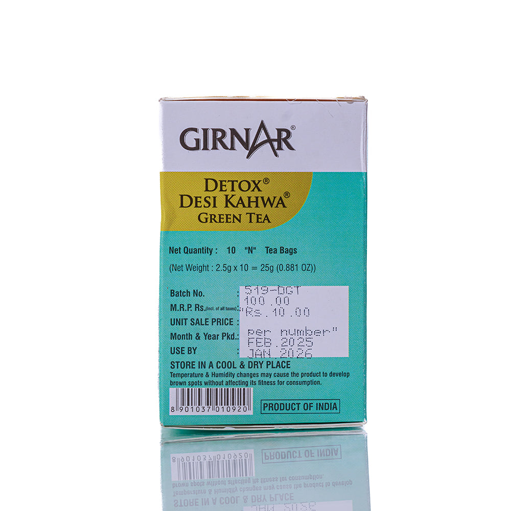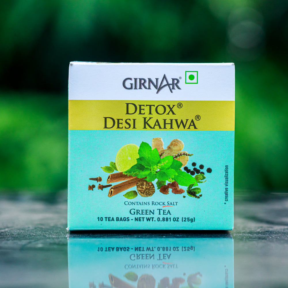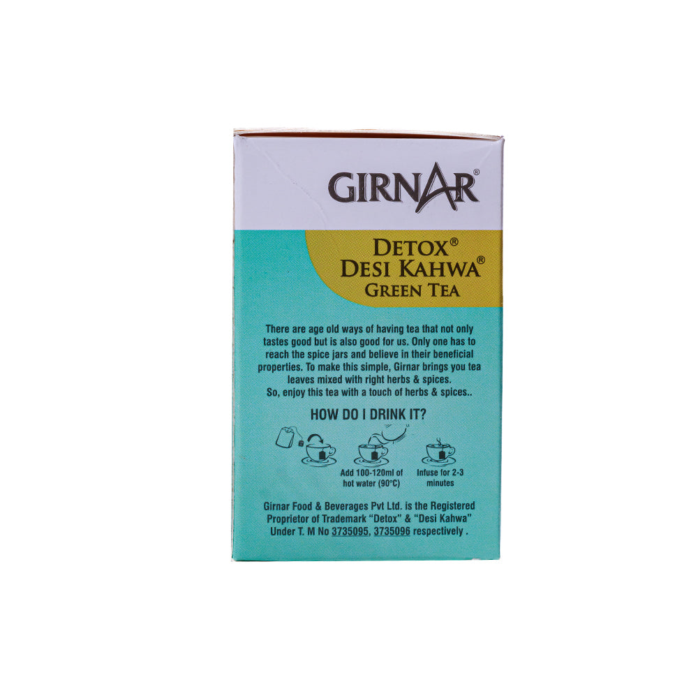 Girnar Green Tea Detox / Desi Kahwa is a herbal tea blend that combines green tea with traditional Indian spices and herbs, aimed at delivering a refreshing and detoxifying experience. Kahwa is a traditional Kashmiri tea that typically includes ingredients like cardamom, saffron, and sometimes almonds, known for their health benefits.